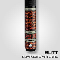 Inspired by the unique and exotic Snakewood, the RETRÔ™ Snakewood Leather Wrap cue features a red-tinted brown base with striking snakeskin-like patterns. The distinctive cue butt design includes five additional rings and a luxurious crocodile leather wrap.